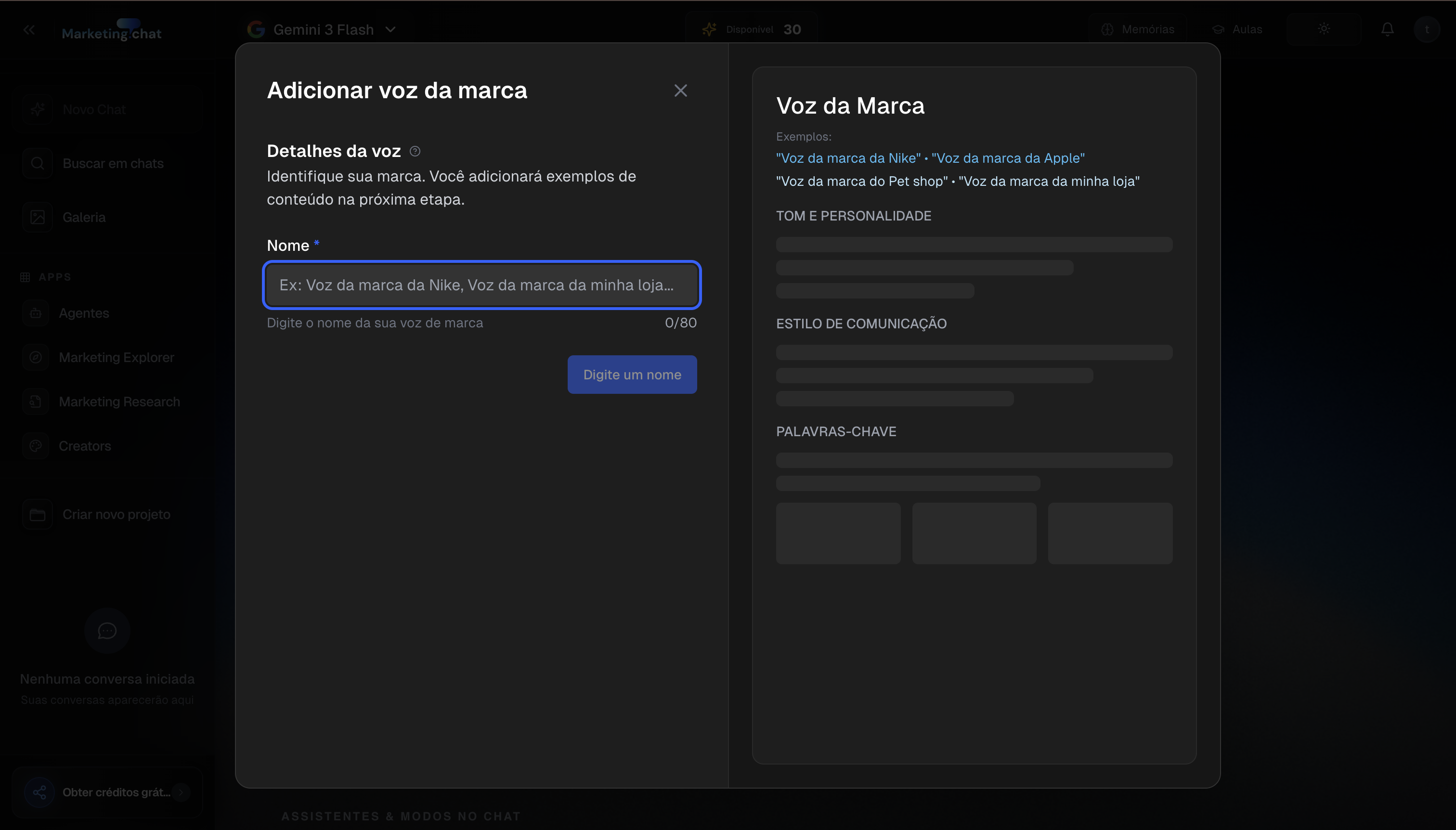 Para criar uma Voz da Marca, acesse o menu de Brand Voice no Chat Especialista ou no Midiakit Explorer e siga o fluxo guiado: